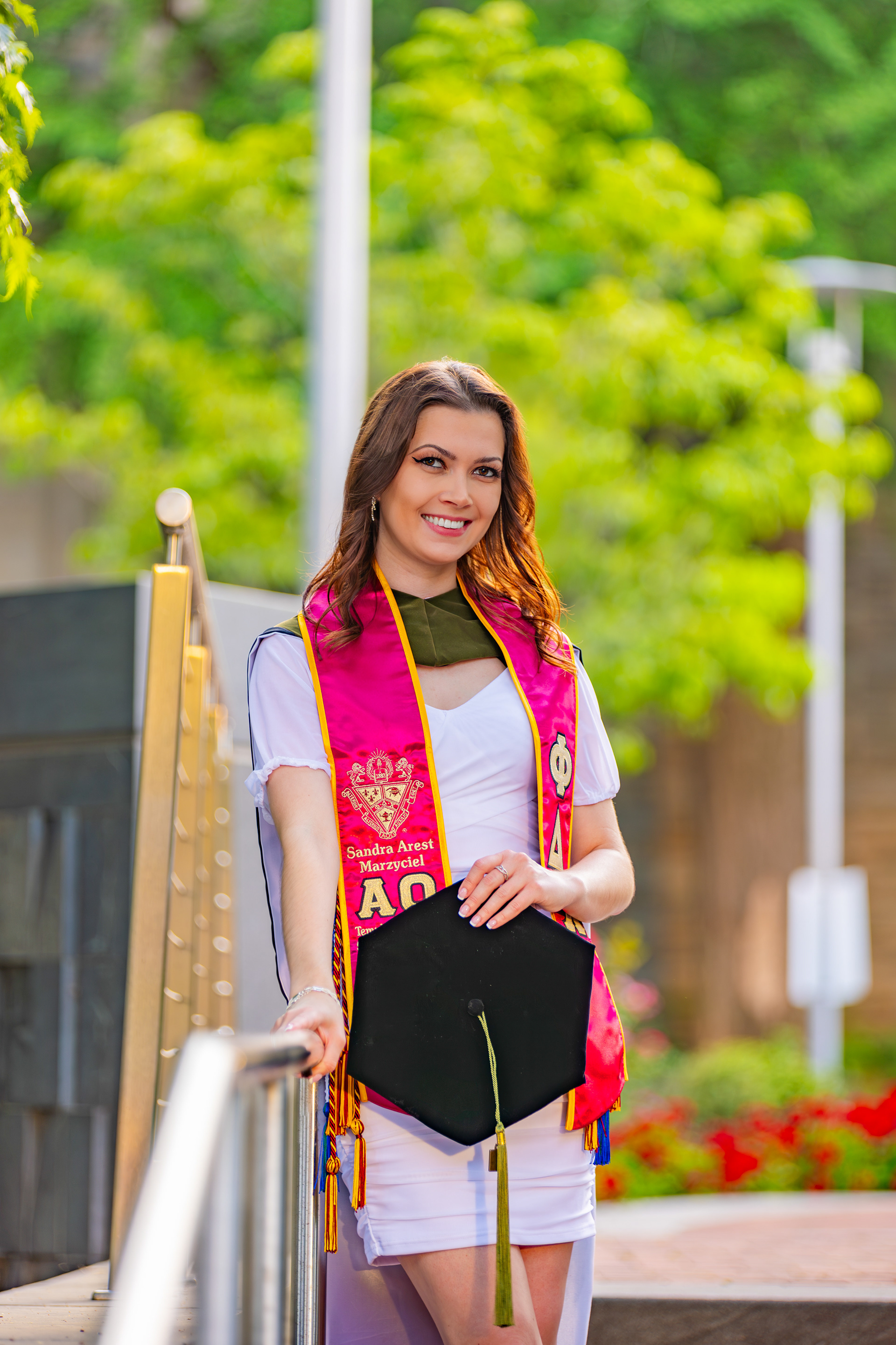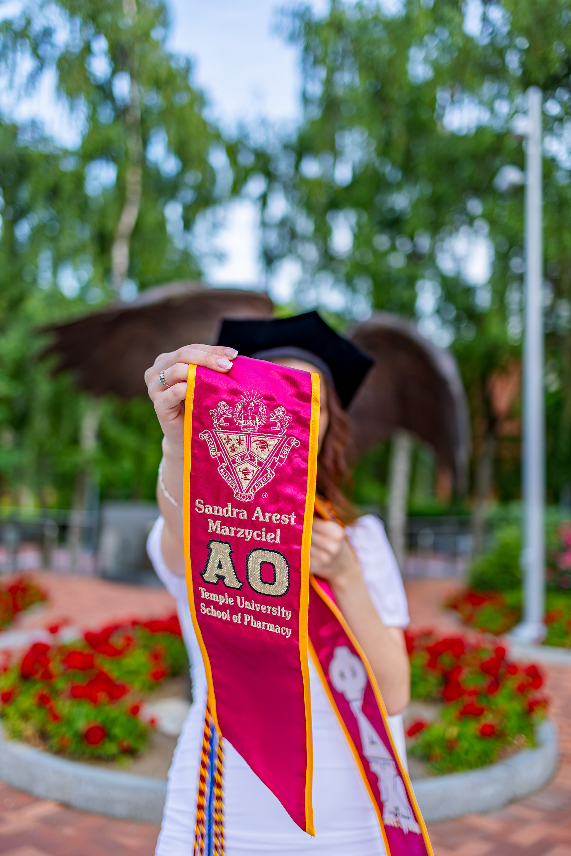 during the photoshoot, I didn't notice that the string from her graduation hood was poking out. thankfully I could resolve that through photoshop. that day was also slightly windy resulting in some flyaways her hair which I fixed in photoshop. I also decided to clean up her graduation cap a little by removing some of the white fuzzies.